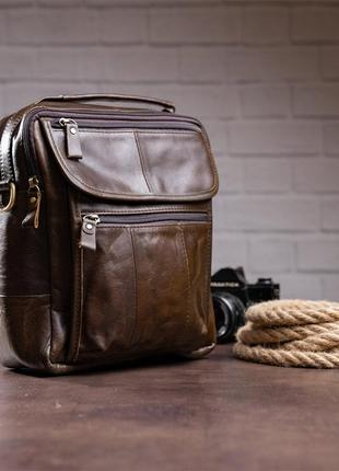 Чоловіча шкіряна сумка зручна в експлуатації і невибаглива в догляді. Сумку можна носити як в руці за шкіряну ручку, так і на плечі за допомогою зйомного ремінця. Складається з 2 основних відділення на змійці. У першому відділенні: - 2 накладні кишені для телефону; У другому відділені: - потайна кишеня на змійці; На тильній стороні сумки кишеня на змійці. На лицьовій стороні кишеня на магнітній кнопці і кишеня на змійці, внизу теж кишеня на змійці. Є текстильний ремінець зі шкіряною вставкою на плече, що знімається. Сумка дуже довгий час залишається в ідеальному стані і має високу зносостійкість. Розмір: ширина - 24 см; висота - 25 см; глибина - 6,5 см. Виробник: Китай.