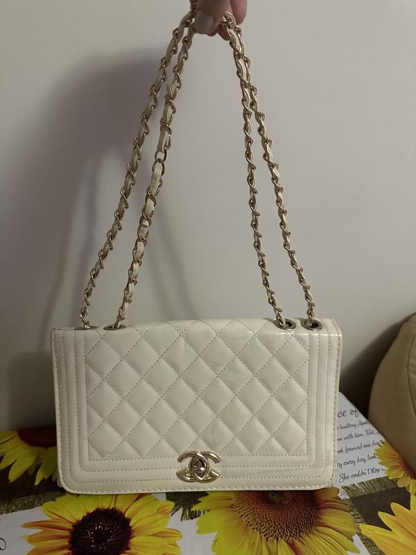красива сумочка,типу шанель, Общее состояние -без повреждений Единый нюанс показала на фото с внутренней стороны сумки, подкладка качественная, целая. Размер Ширина 29 Высота 18 Глубина 9