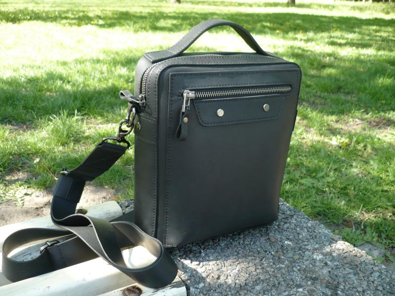 Сумка зі шкіри ВРХ "crazy horse" , колір чорний. Розмір 210*260*60 мм. В основному відділенні є внутрішня кишеня. Зовнішня кишеня, розмір 180*210* мм. Блискавки і собачки YKK (Японія). Сумка прошита вощеною ниткою galaces 0,5 мм. Порізи оброблені засобом tokonole (Японія). Шкіряний ремінь, ширина 40 мм. Ручна робота. Цінність: 2100 грн.