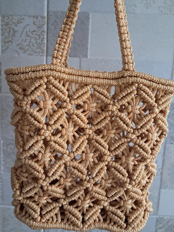 сумочка выполнена в технике макраме. в наличии в двух цветах: - серый - золото шнур - полиэстер. размер: - ширина 25см - высота 23см - высота с ручками 40см