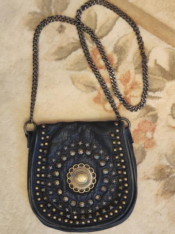 Сумка из натуральной кожи английского бренда Оазис. Металлический декор цвета бронзы и такой же длинный цеп. Состояние хорошее, изстолансов – маленькие зацепки сверху на сгибе, на фото показано. Высота 28, ширина 24 см, длина цепки 95 см