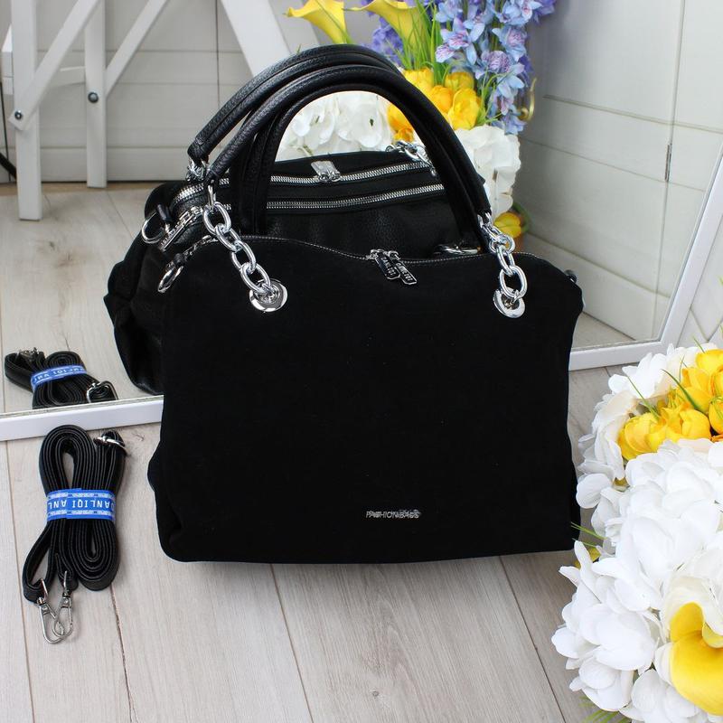 Невероятно красивая новинка 🔥 Код Д649 ☑️Материал: натуральная замша и эко кожа 🔥 ☑️Размер: Ширина по дну -33см Высота - 24 см, Дно - 14 см. Ремешок регулируется до 130 см. Высота ручек 18 см Два отдельных отделения на молнии. В середине открытые кармашки и кармашки на молнии. На обратной стороне карман на молнии.