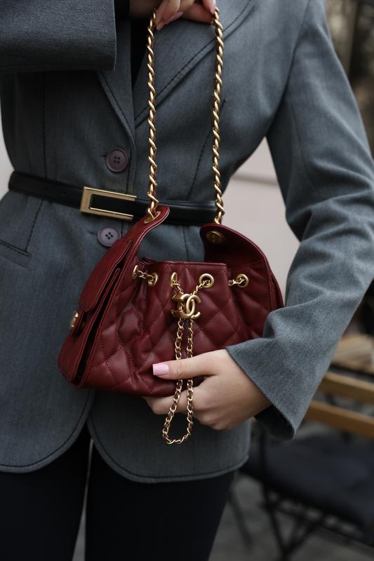 Арт: 991101 ⏺4200 грн | Размер: 22 х 13 х 10 см | Материал: Кожа Cумка выполнена из зернистой кожи с фирменной ромбовидной прострочкой. Внутри одно основное отделение, также дополнительный кожаный карман с гравировкой. Подкладка из плотного текстиля. Закрывается благодаря фирменному затяжному механизму. Фурнитура металлическая и брендированная. Цепочка выполнена в комбинации металла и кожи. Комплектуется в брендовой коробке на магнитах и пыльнике, также есть буклеты.