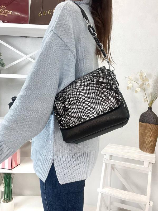 Код 828687 Сумка комбінована шкіра Розмір: 25/17 Матеріал: натуральна шкіра Колір: чорний Форму тримає супер 2 відділення 2 ремінця : ланцюжок та ремінець довгий шкіра натуральна