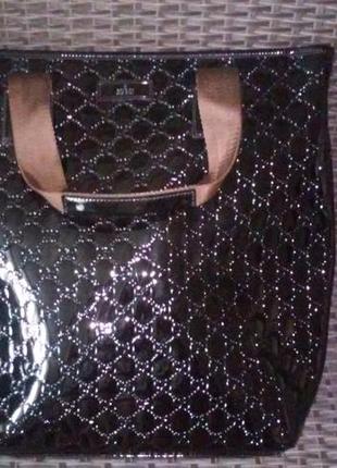 Шикарна, стильна сумка. Лакова. Якісний кожзам,виробництво Італія. Добротна підкладка з бавовни. Ширина - 44 см Висота - 38,5 см Глибина - 14 см Ручки - 24 см від кріплення. Є плечова ручка, незнімна,регулюється до 120 см мах. Можна носити сумку в руках, на плечі. По бічних швах є відходження плівки з бульбашками повітря ,на зовнішній вигляд і якість не впливає. Виробничий брак.