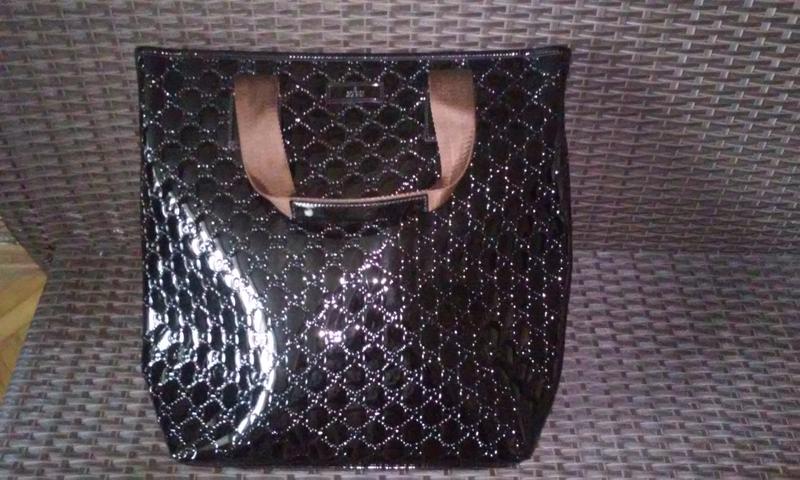 Шикарная, стильная сумка. Лакова. Качественный кожум, производство Италия. Добротная подкладка из хлопка. Ширина - 44 см Высота - 38,5 см Глубина - 14 см Ручки - 24 см от крепления. Есть плечевая ручка, несъемная, регулируется до 120 см мах. Можно носить сумку в руках, на плече. По боковым швам есть отхождение пленки с пузырьками воздуха,на внешний вид и качество не влияет. Производственный недостаток.