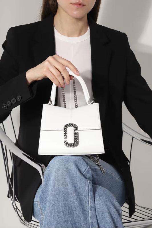 Marc bag, the Mini St Marc is a petite silhouette crafted from luxurious Italian leather It's designed with a distinctive "M" shape and sealed by a chain link J Marc hardware closure at front Inside, it includes two card slots for easy organization Carry by the top handle or attach the removable chain strap to wear as a crossbody bag for hands-free styling. 2P3HSC004H01 Гладка шкіра Магнітний замок Top handle, removable crossbody chain strap 2 card slots У комплекті фірмовий чохол від пилу. 7in 1 x 4in d x 6in h 19cm L x 10cm D x 15cm H Strap 45in (115cm) Ремінь довжини 22 дюйма (57 см) Скидання ручки 4 дюйма (10 см)