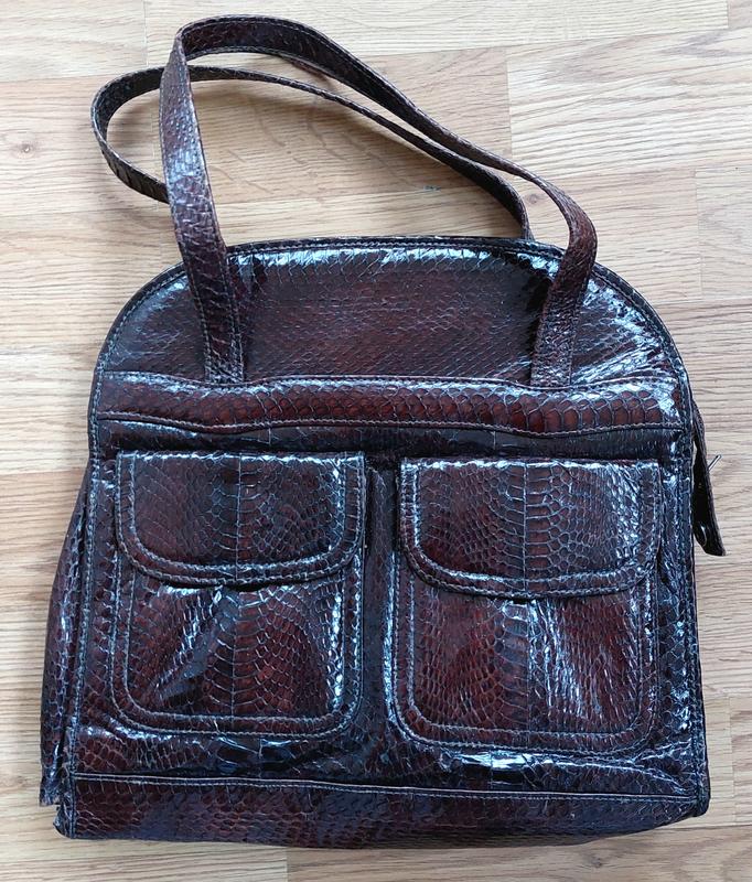 Небольшая, но удобная сумка из искусственной кожи под змею. Один отследенный карман, внутрь карман на молнии.Есть карман снаружи по задней поверхности, два на передней на кнопках.Застежка на смайке.Довгой ручки нет. Ширина 29см,высота 25см,ширина 8см