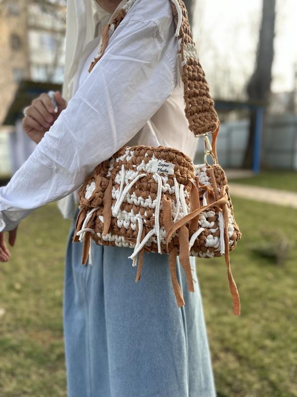 Розхристана сумка на плече Белый с бежевым Трикотаж Фурнитура:Золото Застежка: магнитная кнопка