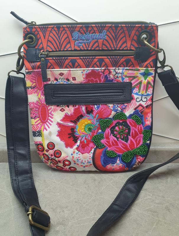 Яркая, стильная и удобная сумка от мегапопулярного испанского молодежного бренда модной одежды и аксессуаров Desigual, что в переводе с испанского языка означает "уникальный". Буйство красок, испанская фиеста, бесконечный праздник и выгодное море – все это нашло отражение в наряде одежды Desigual. Этот бренд для веселых, неординарных личностей, привыкших дарить позитив и жить на полную катушку. Сумка изготовлена из яркой плотной ткани (типа брезент) и экокожи. Сумка имеет одну довгу (65-125 см) ручку, длина которой регулируется пряжкой. Застежка - молния расположена сверху. Спереди есть два внутренних кармана: верхняя - на застежки-молнии, нтяжня - открытая. Внутри один большой отдел, в котором есть кармашек на брендированной молнии + два кармашка без застежек. Фурнитура бронзового цвета. Изделие украшено вышивкой, аппликациями и украшен бисером. Размер сумки: длина 25 см высота: 29 см Будет еще много фирменных вещей. Подписывайтесь! Имейте в виду, что пока вы добавляете товар в ''обаране'', кто-то его уже покупает. И вы можете потерять свой шанс приобрести понравившуюся вещь. Дешевнее покупать сразу несколько вещей-таким образом вы экономите на доставке. При покупке пятки и больше вещей и оплаты на карту продавца сразу – доставка бесплатна. Удачных и приятных покупок! 17.02.24