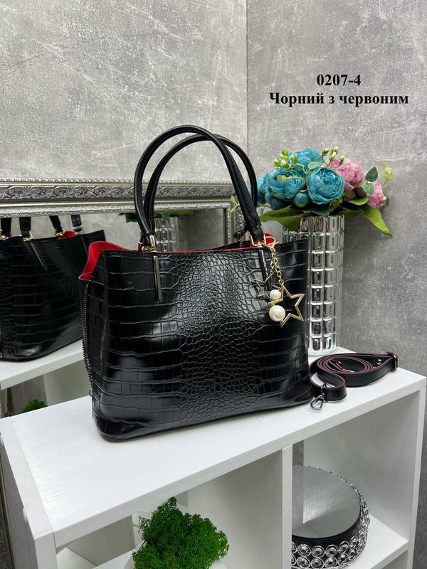 Снова в наличии, но с черным брелком! Три отделения! Очень удобная модель! Стильная и вместительная, универсальная сумка на три отделения, с брелком, дорогой турецкий материал с крокодиловым принтом - 680грн Код 0207-4. Харьков. Брелок в черной фурнитуре! 30 см ширина по дну. 27 см ширина зверху. 23 см высота. 12 см глубина. Высота ручек- 16 см. Максимальная длина плечевого ремня - 130 см Три отделения: среднее отделение на молнии, внутри карман для телефона и внутренний карман на молнии. Остальные два отделения на магните. По бокам сумки молнии, позволяющие увеличить внутренний объем. Эко кожа с крокодиловым принтом. Дорогий турецкий материал.