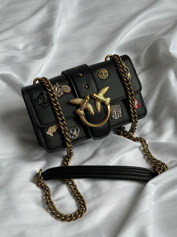 👜 Pinko Mini Love Bag One Simply With Enamel Pin Black (Арт: 99294) 💵 2750 грн 📐 Размер: 21 х 12 х 7 см 🧵 Материал: Кожа 🔎 Описание: Сумка выполнена из гладкой кожи с металлическими пинами. Спереди фирменный логотип за которым скрывается замочек. Внутри два отделения, между ними есть карман на застежке. Подкладка у сумки из приятного на ощупь текстиля. Фурнитура металлическая, брендированная. Для носки через плечо есть золотистая цепочка с кожаной ручкой. Комплектуется в фирменной коробке и пыльнике.