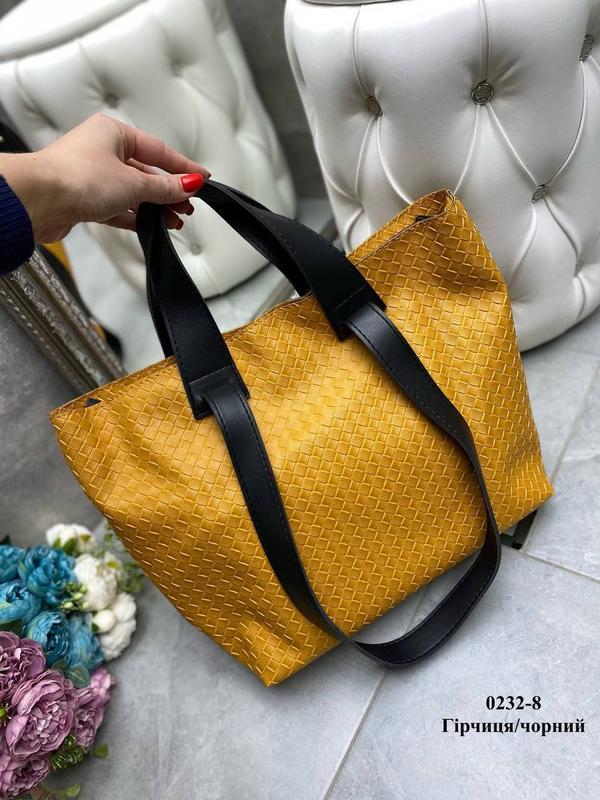ЗНОВУ В НАЯВНОСТІ 📣📣📣 Код 0232-8. Турецкая экокожа с имитацией по плетению. Ширина по дну 34 см. Ширина вгорі 44 см. Висота 30 см. Дно 15 см. Висота довгих ручок 30 см. Одно отделение на молнии, разделенное пополам перегородкой на молнии. Внутри открытый карман и карман на молнии. По бокам сумки карабины для затяжки уголков внутрь. Над основной молнией кнопка. На обратной стороне карман на молнии. Цена 880 грн