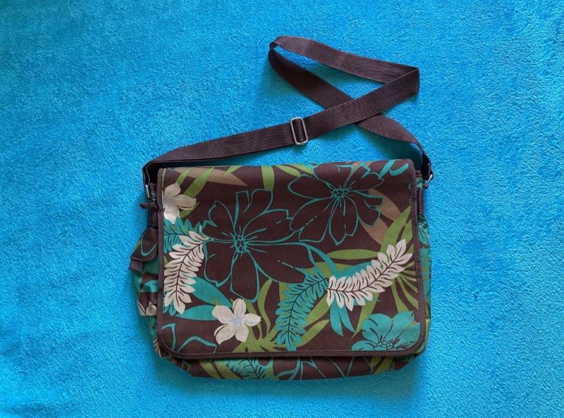 Сумка текстильна з зелено-коричневим квітковим принтом. Висота 30см, завширшки 40,5см, глибина 8см. Два великі відділення, всі блискавки працюють, відсутні затертості, добрий стан, довжина ременя регулюється.