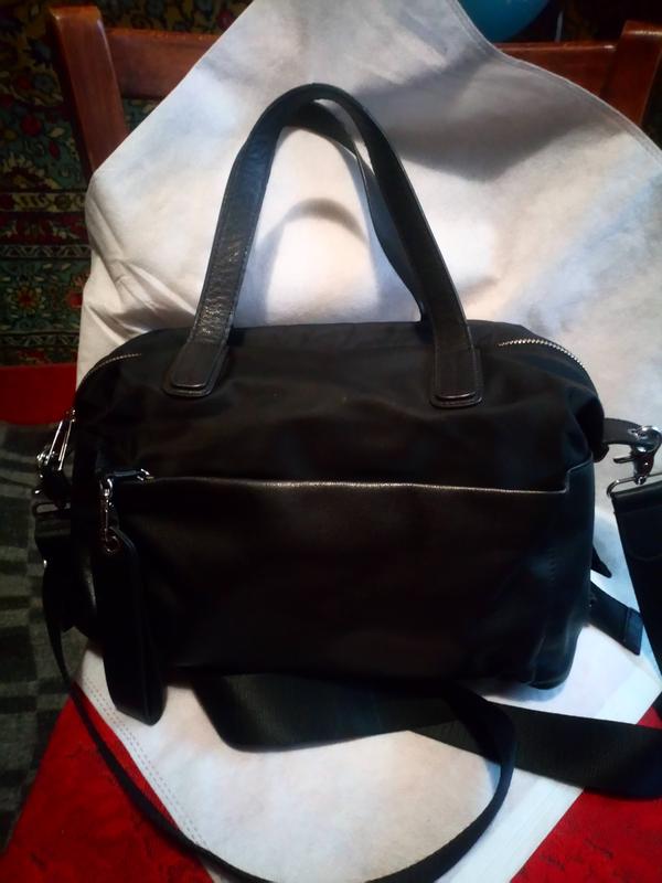 Чудова комбiнована сумка. Натуральная шкира + найлон щильный. Англия. 26/33/12 см, ручки 36 см, довжина рег ременя 135 см. Мистки карманы спереди и сзади на молниях. Сумка добротная, красивая, мистка, с мягкой фурнитурой и подкладкой. Без дефектiв. Цiна остаточна