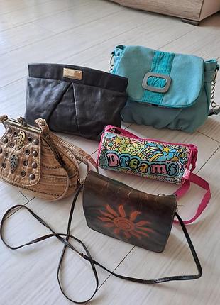 Різні сумки в гарному /нормальному стані.Блакитна нова 200грн,шкіряний клатч новий,привезений з Франції 400грн,інші бв в нормальному стані червона 50грн,з листочком 100грн,з сонцем 120 грн.