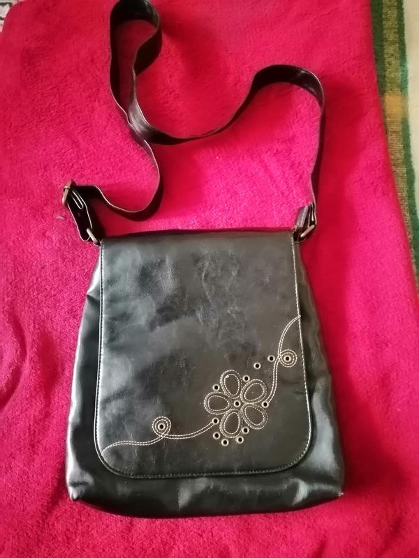 Сумка через плече розмір висота 32см,ширина, внизу 31см,вгорі25см, закривається на кнопку і на горі замочок, в середині два відділення