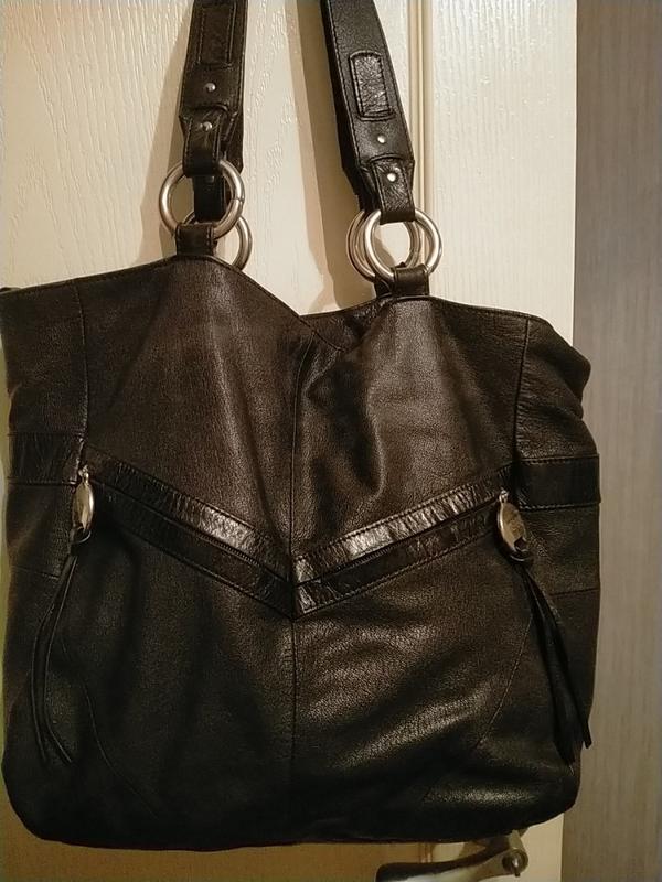 черная, вместительная, как шопер,можно носить на плече, застёжка магнит и с боков дополнительно кнопки на ремешках. спереди два кармашка на молниях. Кожа плотная, зернистая (не убиваемая), без следов носки, ручки кожаные, широкие, в хорошем состоянии, Размер 42*32.