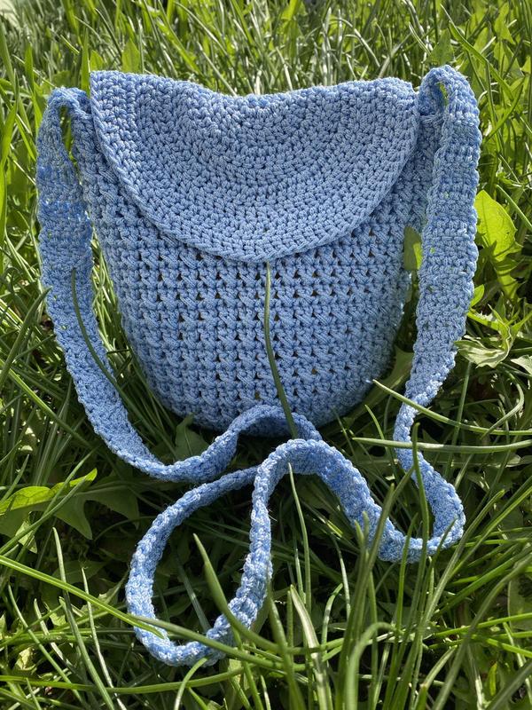 В'язана сумочка через плече з поліефірного шнура. Розмір: висота 18 см, ширина 20 см, довжина ручки 100 см. Дуже містка за рахунок круглого денця. Пришита якісна магнітна кнопка (Туреччина).