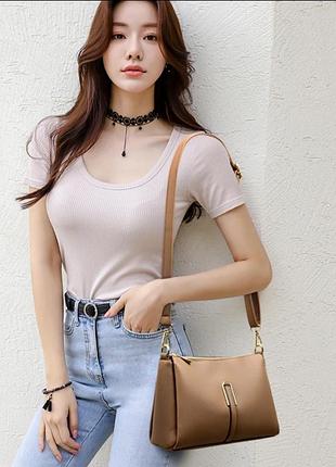 Стильная и удобная женская сумочка. Имеет короткий да длинный ремешок, внутри содержит 3 отделения. Цвет темный беж, материал искусственная кожа
