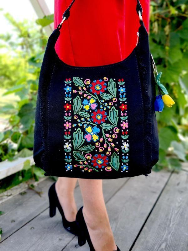 Колекція "Нескорені" створена до дня Незалежності України. Коли почалася ця страшна війна, був страх і розпач. Усе навкруги враз стало чорним та безпросвітним.... Наразі весь український народ воює довгі місяці та я вірю, що крізь чорний морок та червону кров наших втрат проростуть яскраві квіти. Вони заплетуть все навколо і ми подолаємо цю жахливу навалу. Україну неможливо здолати! Тому основа колекції чорний та червоний колір, але він заплетений квітковою вірою в Перемогу! 💗 Сумка з вишивкою пошита зі спеціального сумочного канвасу чорного кольору. 💗 Всередині яскраво-червона підкладка з плащової тканини, що не промокає. 💗 Оздоблення - авторський малюнок в українському стилі від Sokolova перетворений на шикарну вишивку. 💗 Якість вишивки перевірена роками! 💗 Має 3 кишені: збоку є велика кишеня, для зручного швидкого доступу; всередині ще дві кишені, щоб зручно розкласти всі речі. 💗 Ручка довжиною 40 см., дозволяє нести сумку в руці або на плечі. 💗 Зверху закривається на блискавку. 💗 Прикрашена підвіскою в кольорах нашого прапора. 💗 Має м'яку форму. 💗 Великого розміру: 38х35х10 см. Ця річ для справжніх поціновувачів української краси. ❗ Сумка виготовляється під замовлення. Час виготовлення 14-21 днів.