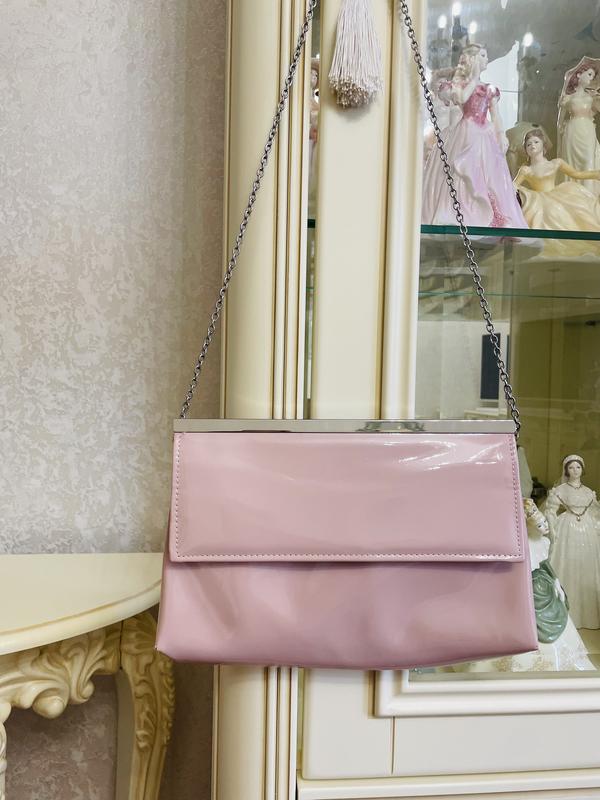 Лаковая сумка клатч нежно-розового цвета!!! Можно носить на плеча, используя цепочку, либо спрятать ее внутрь и носить как клатч! Очень красивый цвет, мягкая фактура и металлическая планка серебристого цвета сверху сумочки! Внутри одно отделение и карман, застежка на кнопку! Достаточно вместительная! Размер 27*18 см, длина цепочки 91 см