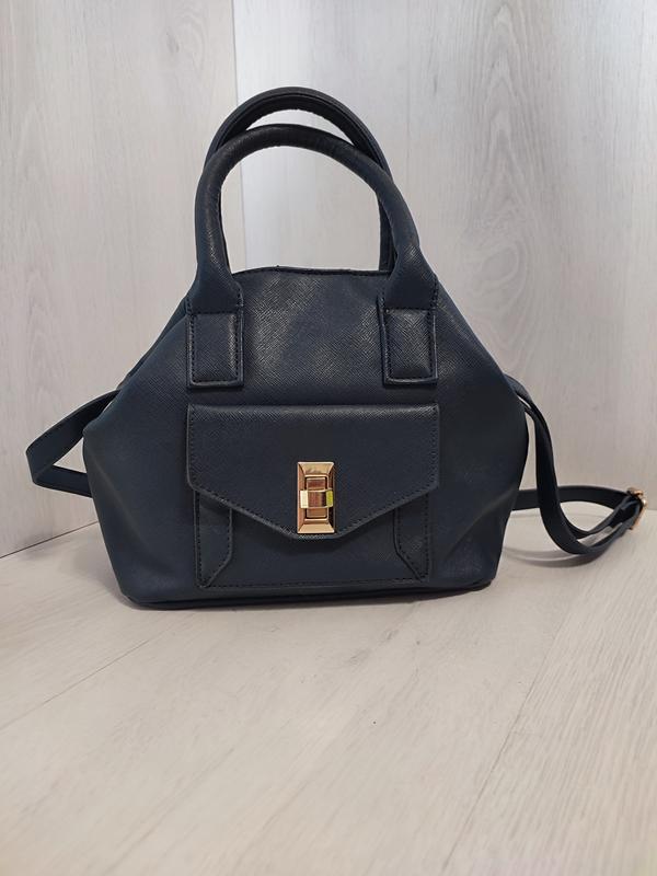 Стильная сумочка фирмы F&F,в красивом темно синем цвете, маленище и очень содержимое, из качественного прочного материала, потертости отсутствуют.20.5/36 верх,ширина дна 13 см, ручки 34 см