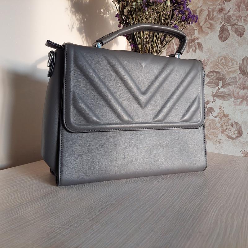 сумка из эко кожи, темно-серого цвета, внутри одно большое отделение с дополнительными карманами, застежка на молнии и магнитный клапан. Высота 24 ширина 30 дно 12 ремешок до 135 см В наличии.