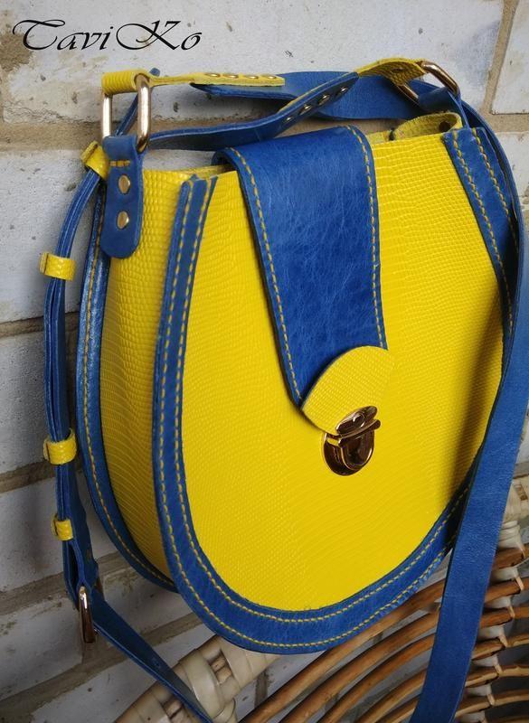 Шкіряна жіноча сумка, жовто-синя кросбоді яскрава кругла сумка яркая сумка кожаная желто-с...