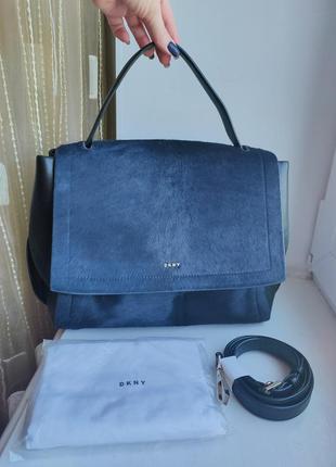 кожаная сумка DKNY, цвет синий с черным, клапан из натурального меха, размеры 40*26см, сзади карман на молнии, имеет задор, длинную ручку, НЮАНС: на обратной стороне частично вытерлось мех, я сфокусировала максимально страшно, шоб вы видели недостаток, но не видели все так страшно, есть варианты или обрезать поломку, или украсить, то уже по вашему усмотрению. последнее фото. цена этой сумочки 17 000, фото добавляю.