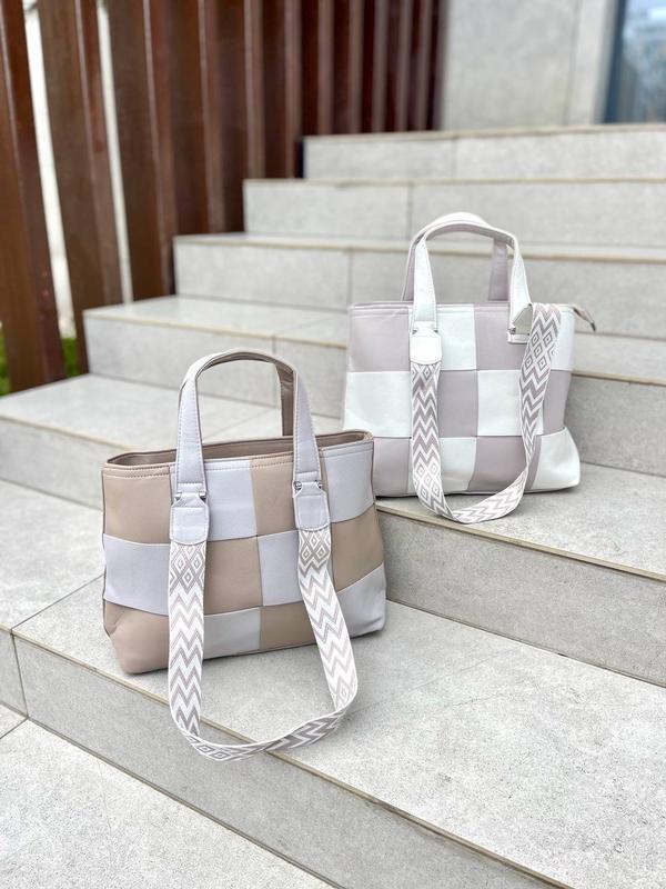 Код 828791 Сумка 2х цветная 4 ручки Размер: 34/24 на молнии, декор ручки текстиль Материал: экокожа Носиться на 2 сторони Цвет: белый; беж