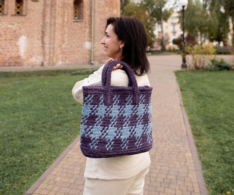 Акцентная сумка ручной работы связана вручную из мягкой вельветовой пряжи. Держит форму. Застегивается на магнитные кнопки, внутри хлопковая подкладка и 2 кармана. Жаккардовая сумка в единственном экземпляре. Дополнительные характеристики: Цвет : Голубой Цвет : Фиолетовый Материал : Трикотажная пряжа Модель : Сумка-портфель Узоры и принты: Клетка Цвет: Голубой Тип сумки: Объемная/Сумка-тоут Форма: Прямоугольная Размер: Большой