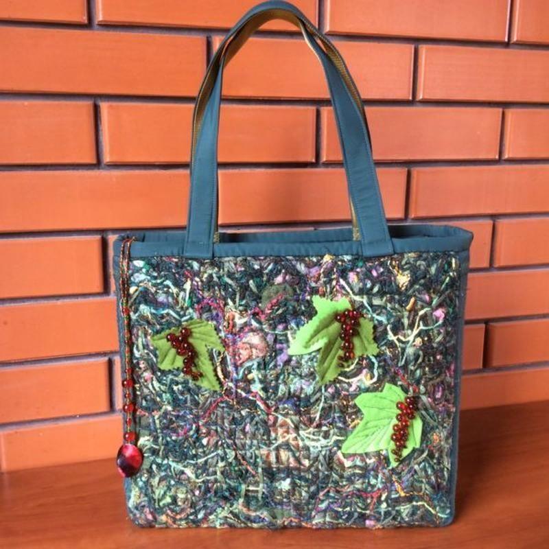 Текстильная сумка «Ягодка» Текстильная сумка из плащевой ткани и авторской ткани из пряжи. Декор — бусины, бисер, фетр, декоративная машинная стёжка. Внутри есть три кармана для мелочей, один из них на молнии. Застёжка сумки — молния. Дополнительные характеристики: Цвет : Зеленый Материал : Текстиль Материал : Трикотажная пряжа Модель : Трапеция Размер: Средний