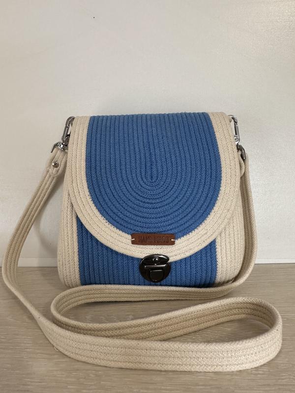 Сумка ручної роботи виконана з бавовняного шнура кольорів джинс та бежевий Розміри сумки: висота 20 см ширина 18 довжина довгої ручки 118 см