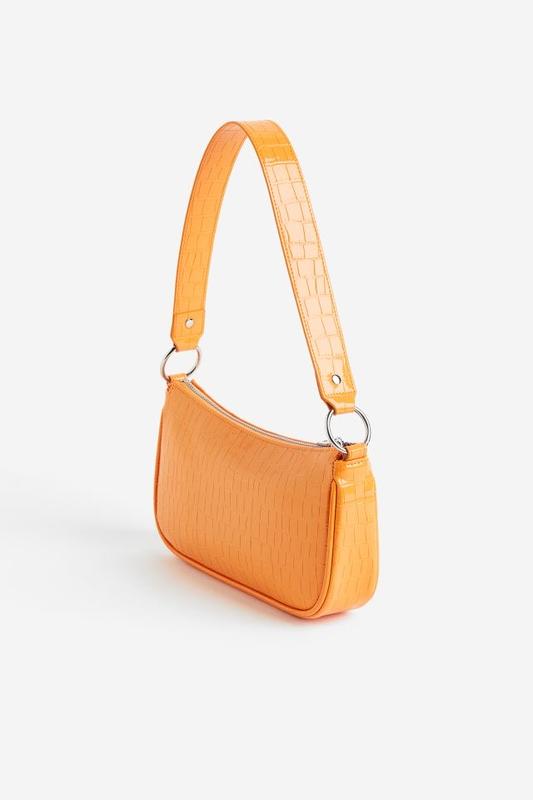 Маленька сумка на плече з імітаційної шкіри з крокодиловим візерунком із застібкою-блискавкою у верхній частині та коротким плечовим ремінцем. Глибина 4,5 см. Висота 14 см. Ширина 25 см.