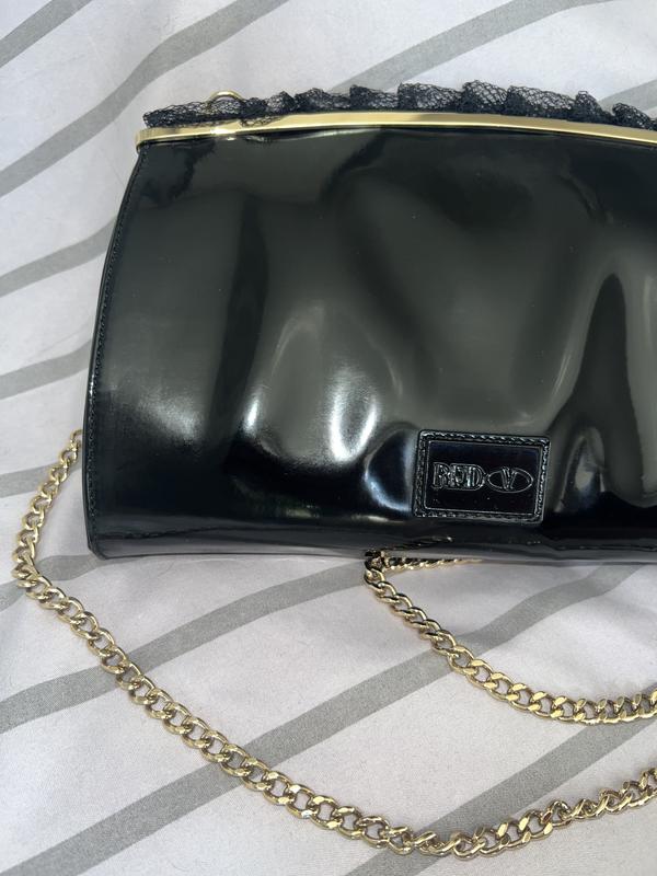 ЧУДОВИЙ ПОДАРУНОК сумочка RED VALENTINO. Чорна, лакова, з золотою фурнітурою і вставкою і синтет.мережива. Одне відділення, є невеликий карманшек з лого, ручка - ланцюг. Форма - невелика трапеція. Розміри: довжина ланцюжка - 100 см, довжина по днищу 23.5 см, довжина по верху 22 см. Ширина 5, 5 див.