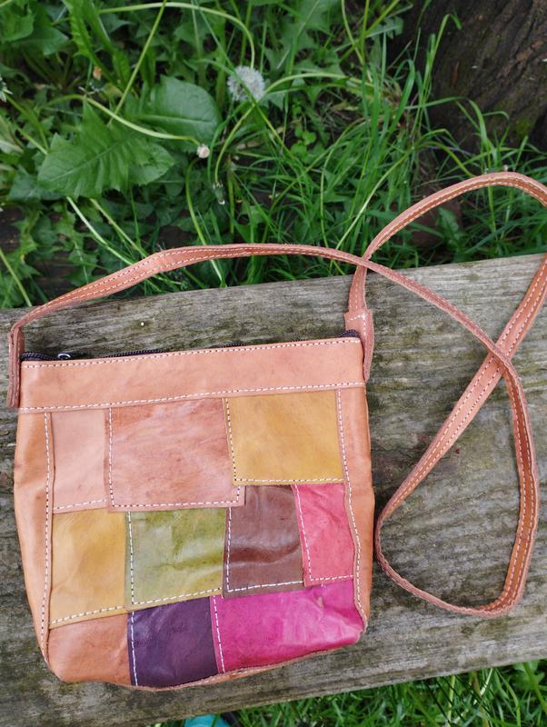 Сумка шкіряна не професійного пошиття. Шкіра жорстка. Ручка довга, не регулюється. Кишені немає. Розмір на фото. Дефектів немає,крім самого пошиття.