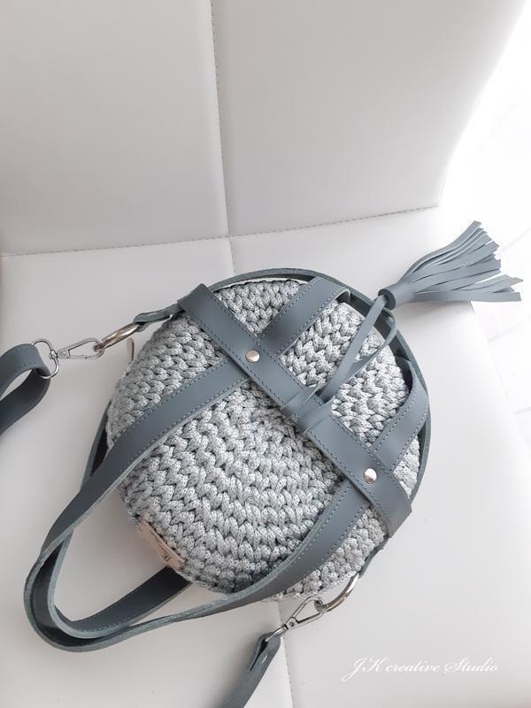 Круглая сумочка "Портупея" из рр-шнура практичного и лёгкого с вставками из натуральной кожи. В сером цвете. Подкладка из хлопка. Ручная работа. Размер: 20х10см. Длина ручки 130см. Дополнительные характеристики: Цвет : Серый Материал : Кожа Материал : Текстиль Материал : Трикотажная пряжа Модель : Каркасная Модель : Через плечо Размер: Маленький Размер: Средний Товар под заказ