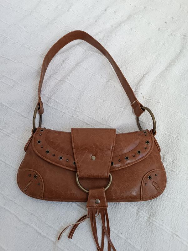 маленькая сумка из экокожи. застегивается на магнит внутри есть карман на молнии. есть две крошечные царапины.Длина 27 см, высота 13 см. Длина ручки с кольцами 57 см.