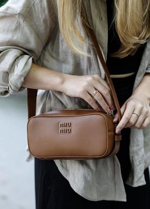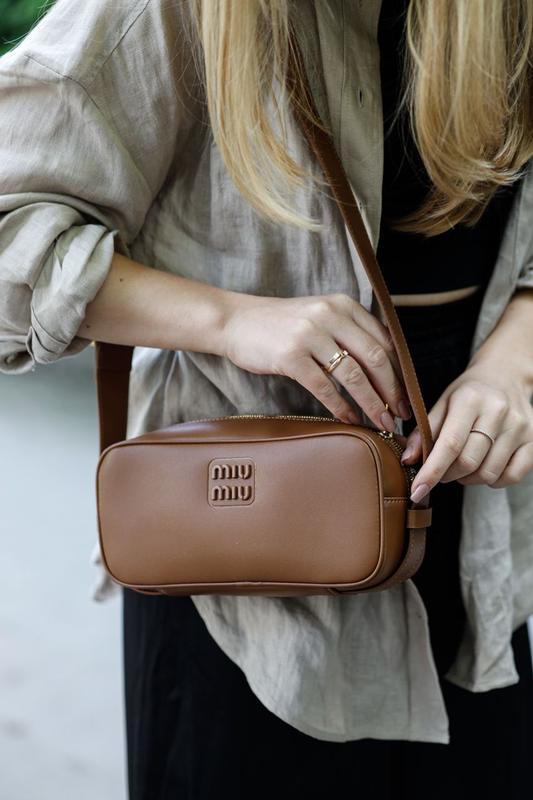 ❤️ MiuMiu Nappa Leather Shoulder Bag Brown (Арт: 99398) <unk> 3600 грн <unk> Размер: 25 х 12 х 8 см <unk> Материал: Кожа <unk> Описание: Сумка выполнена из гладкой кожи с металлическим лого в цвет сумки. Внутри одно отделение, также есть карман на застежке. Подкладка из приятного на ощупь текстиля, есть брендовое металлическое лого. Закрывается сумка на застежке. Фурнитура металлическая и брендированная. У сумки есть широкий ремешок для ношения через плечо (с регулируемой длиной). Комплектуется в брендовой коробке на магнитах и пыльнике, также есть буклеты.
