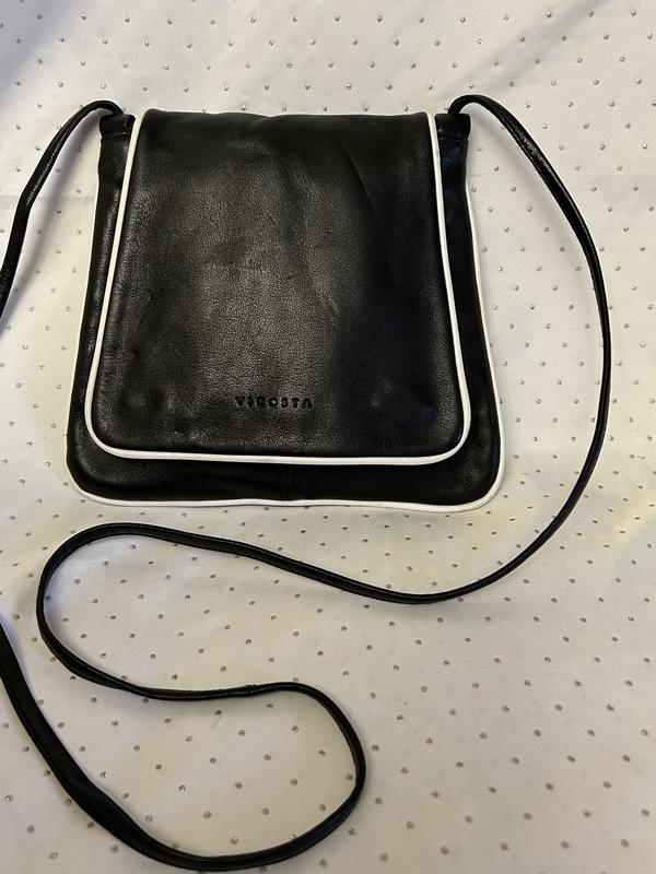 Небольшая сумочка из очень качественной гладкой кожи. Vicosta Испания. Б/у, состояние отличное. Есть легкая некритичная примятость -последнее фото. В цене учтено. Сумочка на одно отделение с боковым карманом на молнии. Закрывается накидным клапаном на две магнитные кнопки. Цвет черный с белой отделкой по краям, Р/р высота 20 см, ширина 18-21 см, ручка 120 см.