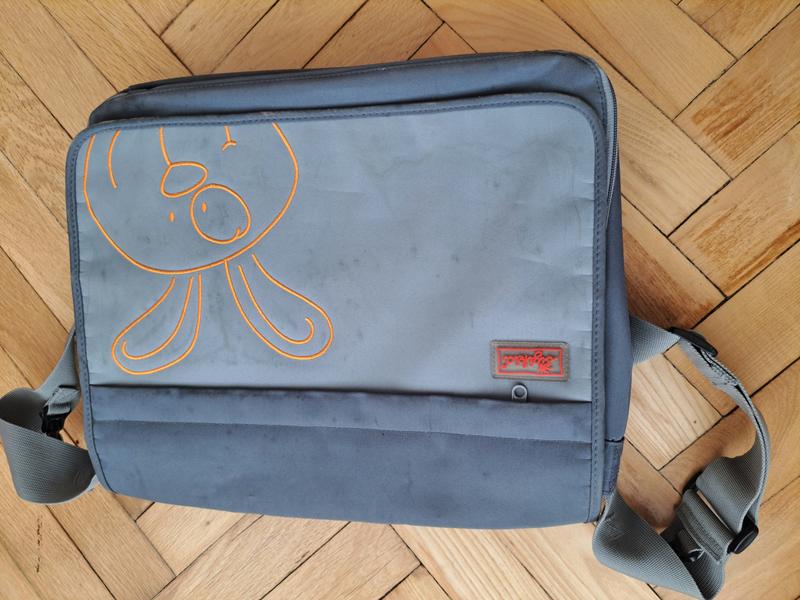 Сумка має три відділення, два великих і одне меньше. Два зьемних гаманця(на липучках).дві ручки:маленька та долга на плече(регулюється по довжині).Спереду та зі зворотнього боку відділення на блискавці,всередині-відділення на липучці. Все працює.Виробництво Німеччина. З недоліків:брудна(потребує чистки або прання)
