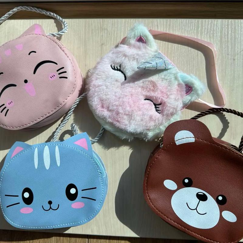 Маленькие сумки через плечо из искусственной кожи котики и мишка, а также искусственный мех единорог Кольори: Котик нежно серый и бежевый, • мишка коричневый, А единорог разноцветный Цена: 100 грн 1 шт