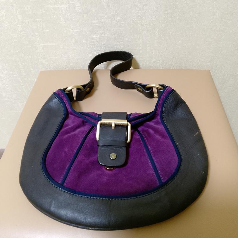 Красивая небольшая сумочка, состав кожа и замша, цвет коричневый и фиолетовый, качественная брендированная фурнитура. Имеет нюансы: несколько мелких царапин на коже, и пятна от ношения на замше на задней части, все показала на фото,26нсы не критичны. Размер 28*18 см.
