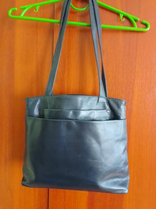 хорошая большая сумка из гладкой натуральной кожи с множеством отделений. Имеет отделение на молнии, на магнитных кнопках и другие. 27/30/10 см, ручки 67 см. Цвет темно - темно-синий. Дефектов нет. Качественная,хорошая вещь.