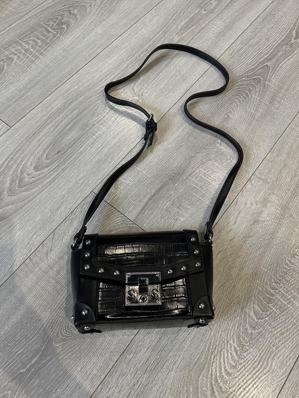 маленькая черная сумка, с змеиным принтом и фурнитурой, цвета стали, имеет длинный регулируемый ремешок