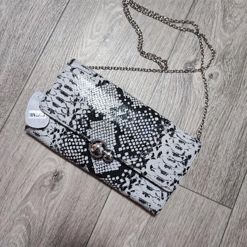 Новая кожаная сумка с цепочкой на плечо. Принт рептилии. В середине три отделения + маленькие. Закрывается на магнит. Размеры 23*14 см.