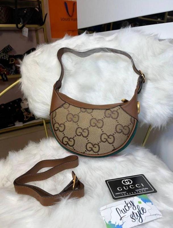 Канва бежевого и черного дерева, с отделкой из коричневой экокожи. Зелено-красная паутина внизу Одно основное отделение и маленький кармашек. Регулируемая ручка с перепадом высоты. Размер: 23 на 13 см