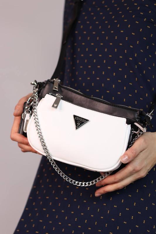 GUESS ARIE double pouch crossbody black/white 📌Арт: 3204 Опис: 🔗 Розмір: 24х15х5 21x12x3,5 🔗 Матеріал: Еко шкіра Сумка виконана з якісної еко шкіри. Складається з двох окремих сумочок різного розміру - більшої - основної та меншої, які кріпляться один до одного карабінами. Їх можна носити як окремо так і разом. Основна сумочка - має одне велике відділення та бокову відкриту кишеньку та бокову кишеньку на блискавці. Підкладка текстильна. Ремінь з еко шкіри, який регулюється по довжині. Фурнітура срібного кольору. Також є металевий ланцюжок срібного кольору. Пакування: брендова коробка, пильник, наповнювач, наліпка. ✅2100 грн.