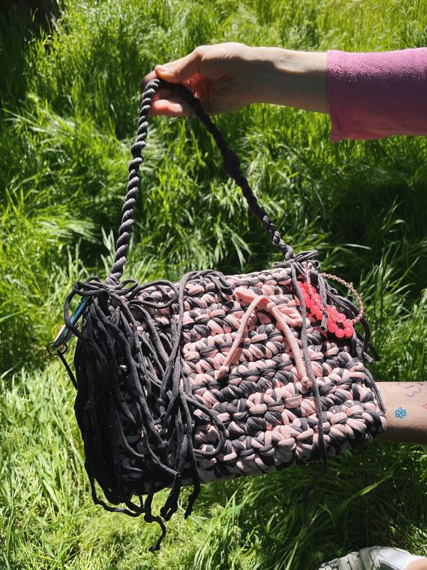 Сумка ручной работы "МЕТЕЛИК" розового и темно-серого цветов с подвесными аксессуарами, железным карабином и уникальным номером. Ручка изготовлена из пряжи. ДЕТАЛЛИ - Размер: 18см (высота) x 25см (длина) - Высота ручки: 22см - Материал: переработанный хлопок - 90%, эластан - 10% - Лишь ручная стирка (перед ручной стиркой снимите аксессуары)